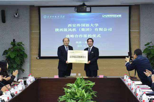 隨后,王校長和李董事長在與會代表的見證下簽署了《西安外國語大學-陜西鼓風機(集團)有限公司戰略合作協議書》,并互授 “國際化實習創新基地”牌和“國際化人才聯合培養基地”牌。