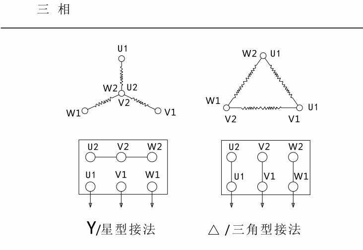 從上圖可以看出有兩種接線方法,這是針對不同的情況來設(shè)置的,3kw(包含3kw)以內(nèi)默認的連接方式為Y型(右圖)、4kw(包含)以上的為△三角型接線方式(左圖),如果是特殊電壓的,如出口至國外的,拿不準主意的,可以咨詢我們公司技術(shù)人員。